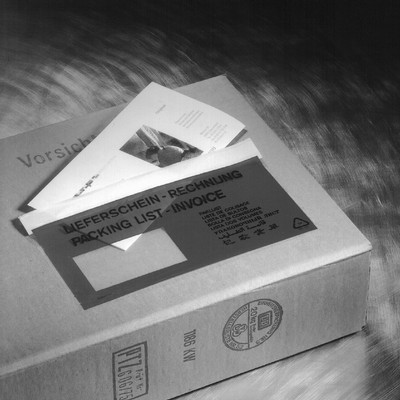 - Aufdruck: Fläche rot mit ausgespartem Fenster 50 x 95 mm, als Begleittaschen mit Text schwarz "Lieferschein/Rechnung" oder als neutral-transparente Dokumententaschen ohne Aufdruck. Jeweils selbstklebend.